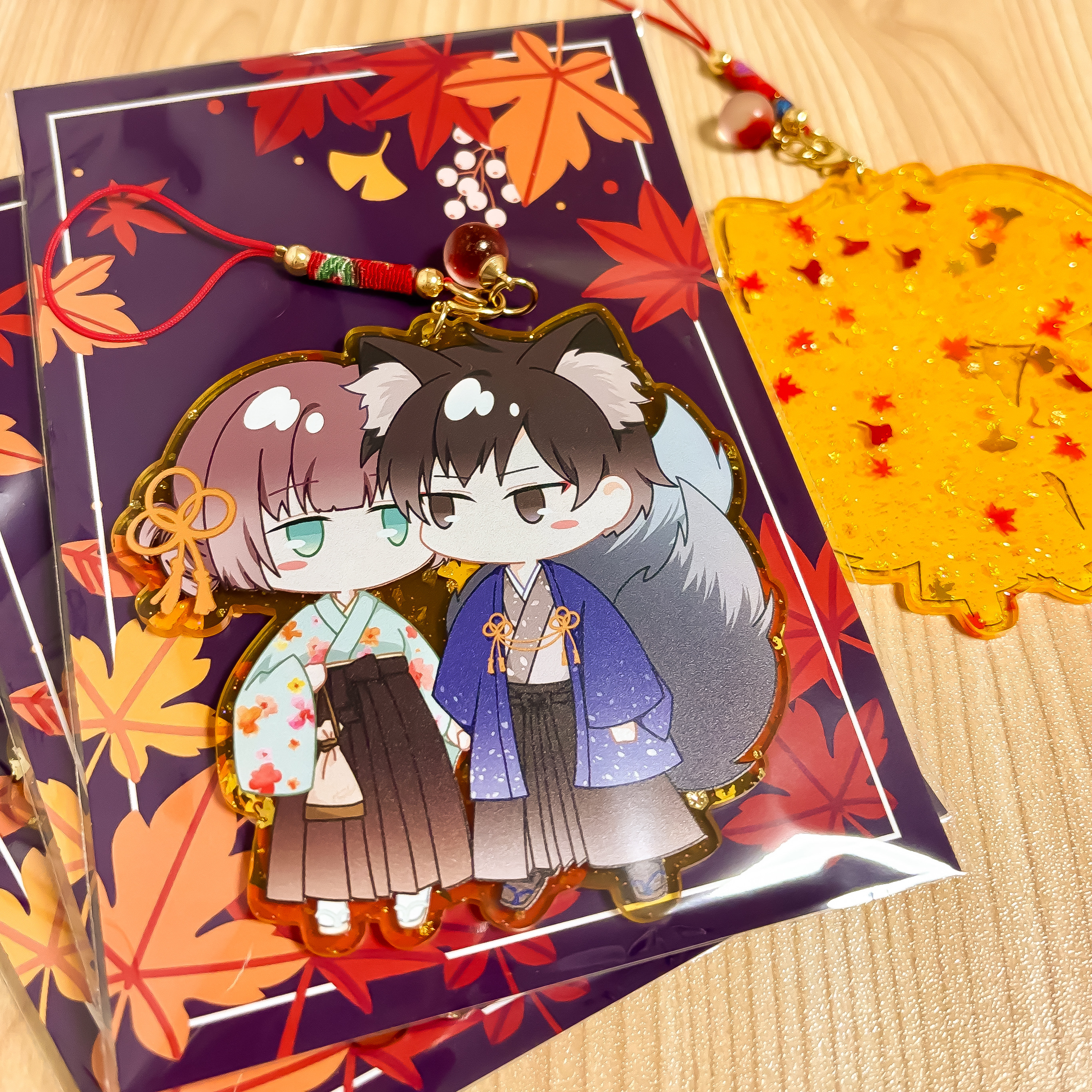 お狐秋声くんが弊館司書ミドリさんを連れて紅葉狩りに訪れた様子をアクリルキーホルダーにしました。写真やポストカードと一緒に並べたりなど、2人の秋の雰囲気を味わう和やかな時間を共有頂けたら嬉しいです♡