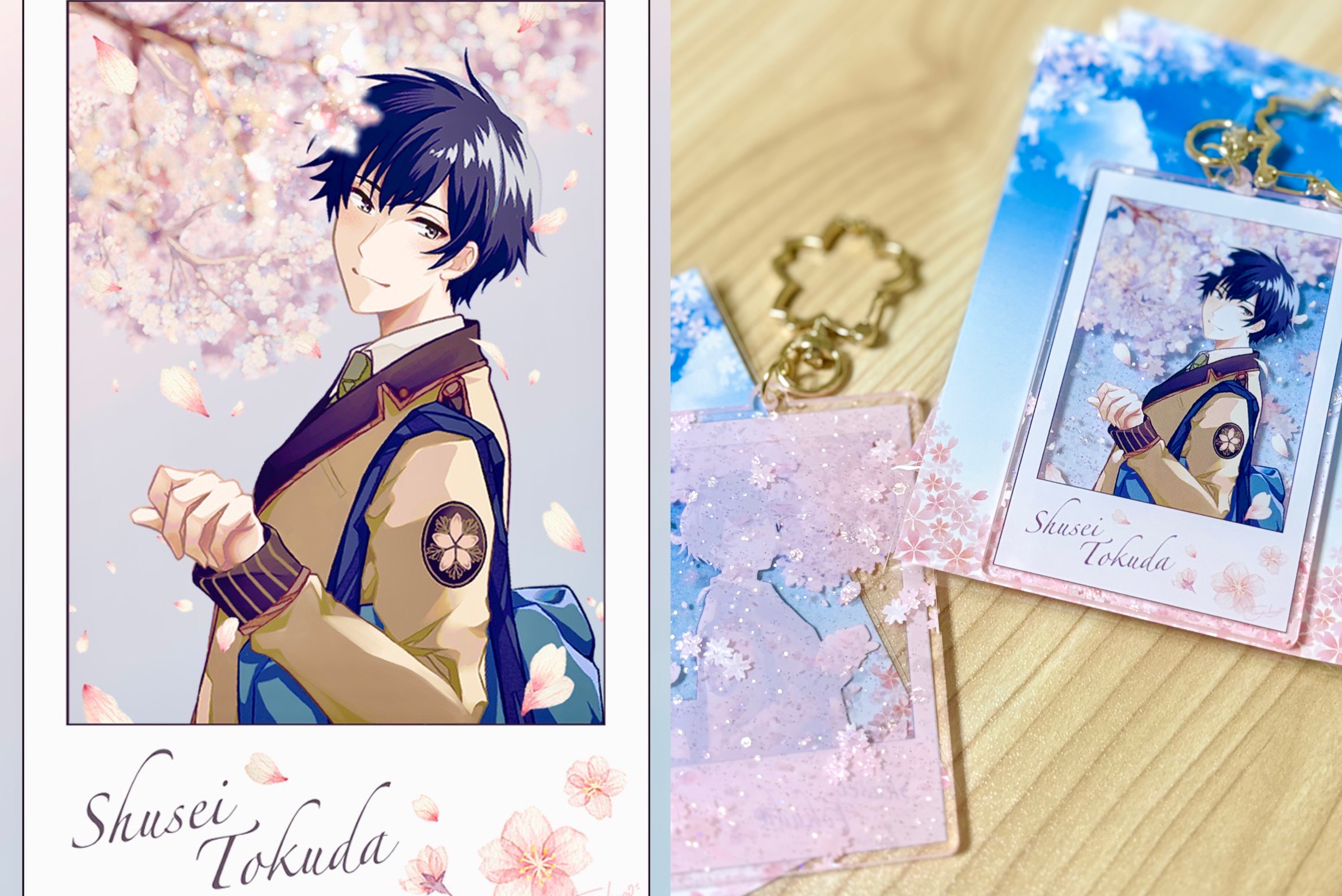 05月05日(東京)SUPER COMIC CITY 31 「超或る図書館にて 2024」にて頒布したキラキラアクキーです。桜舞うフォトフレームの中で、学生服秋声くんが手を伸ばそうとしています。お出かけの際にはぜひ一緒に連れて行ってやってください♪